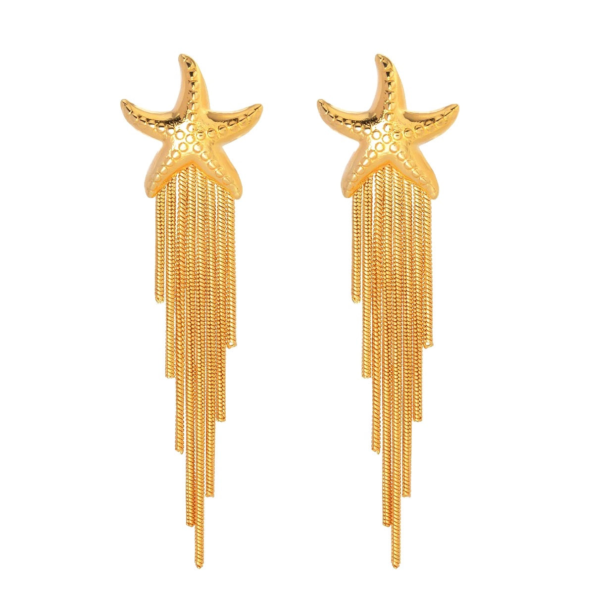 The Soleil Starfish Tassel Earrings were inspired by the elements of nature. Accented with a cascade of asymmetrical herringbone tassels. These are made to bask in the sun, salt and sea on your next getaway. A sempiternal piece made and designed to feel luxe.