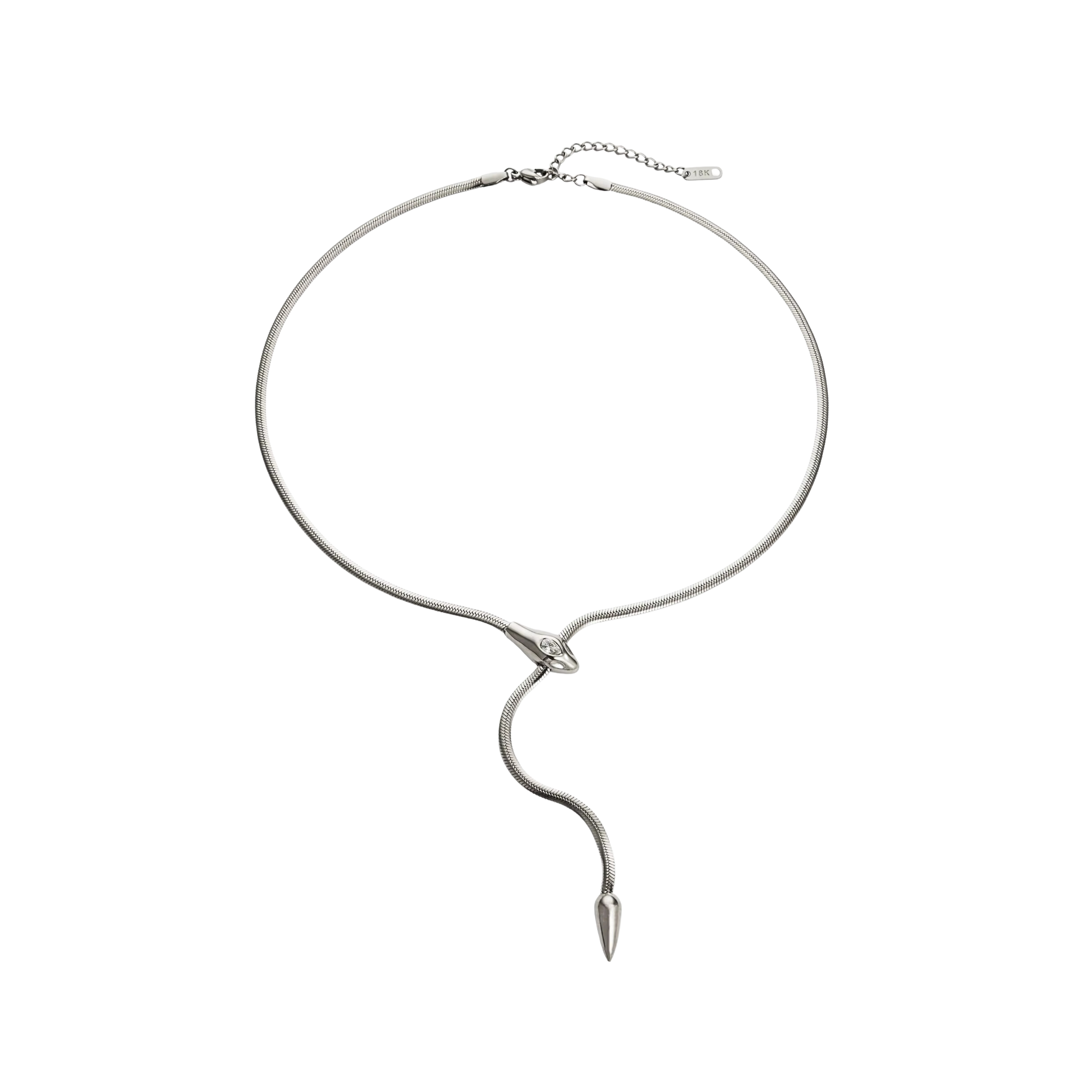 Elevate your style with our Serpentine Necklace. Featuring a stunning serpentine lariat design and a delicate herringbone chain. The cz stud on the snake head adds a touch of luxury and sophistication. Perfect for any occasion, it's the ultimate statement piece for the modern woman.